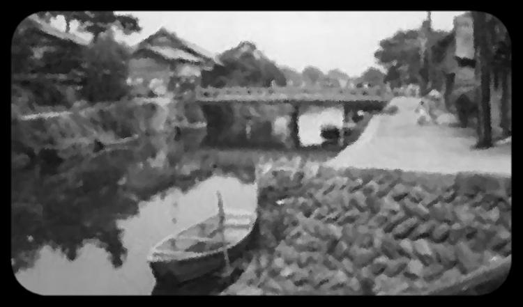 次第に小さくなつて行く水上商の舟。