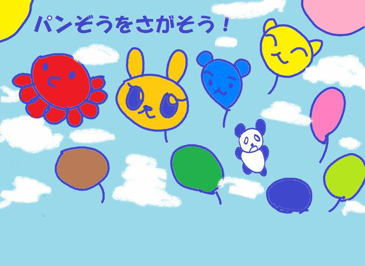 たいへん! パンぞうが風にふかれて、空飛ぶふうせんたちのなかにまぎれこんでしまいました。